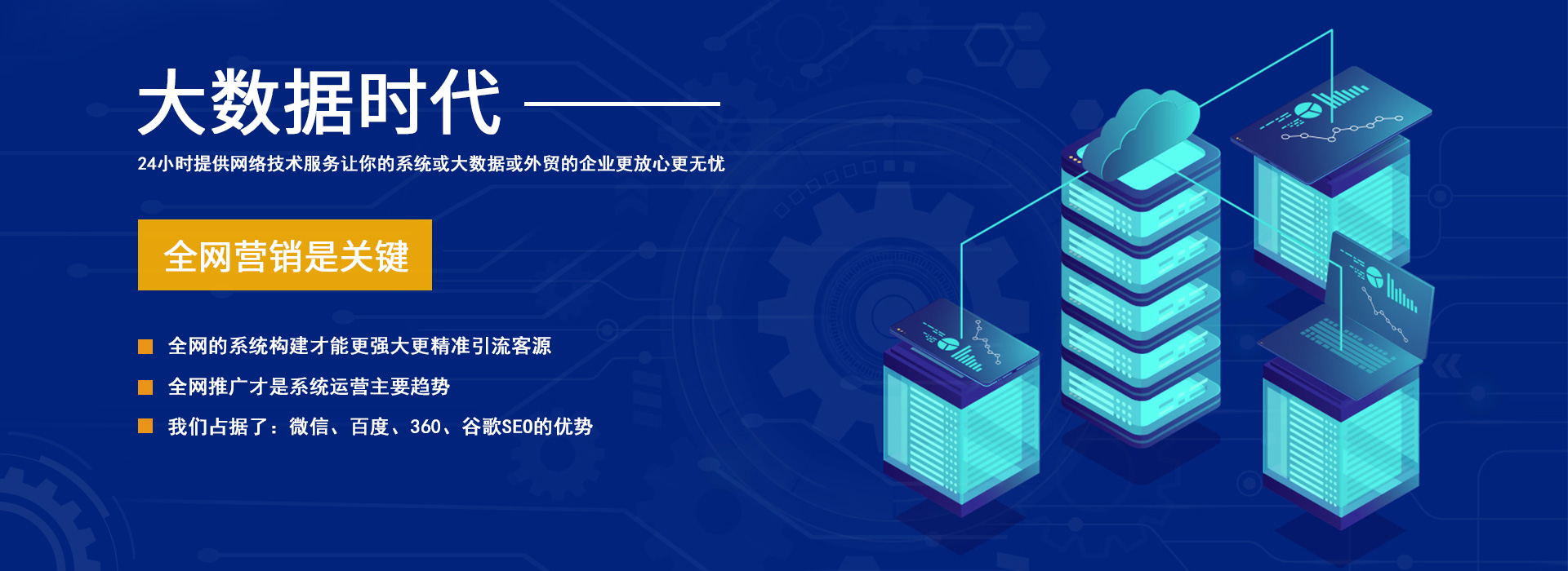 服務特色:24小時提供網(wǎng)絡技術支持,讓你的系統(tǒng)或大數(shù)據(jù)或外貿(mào)的企業(yè)更放心更無憂。